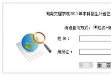 湖南文理学院2015年外省艺术类专业校考成绩查询网址入口 成绩查询请使用 "姓名+身份证号 "的方式进行查询。