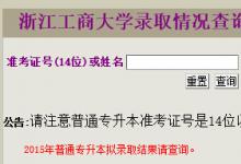 浙江工商大学2015年专升本录取结果查询网址入口 请注意普通专升本准考证号是14位以2015开头。2015年普通专升本拟录取结果请查询。