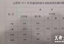 2015年云南高考分数线公布 本科第一批次:文史类540分,理工类500分;本科第二批次:文史类470分,理工类425分,艺术(文)365分;艺术(理)330分,体育(文)365分,体育(理)330分;