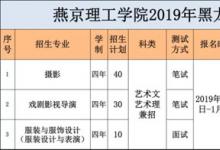燕京理工学院2019年艺术类专业校考公告燕京理工学院2019年在在河北、黑龙江、江西、江苏、山西、山东、广东等省份组织艺术类校考,专业含摄影、广播电视编导、戏剧影视导演、 ...