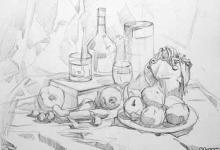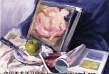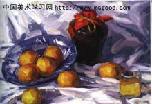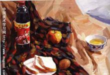 色彩静物写生,水粉静物写生步骤,静物写生步骤照片说明:注意构图的完整,形体的准确 物体的明暗和投影部位一定要精确刻画,桌面和背景衬布的形体一样不可以忽视 静物写生步骤