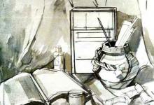 色彩作画步骤(书籍、陶罐、画笔、颜料)1 此组为文具类静物,梯形构图。打完轮廓,用普兰加熟褐加清水,薄薄地画出简约的明暗关系。再一次纠正形体结构及透视方面存在的问题,明确色彩