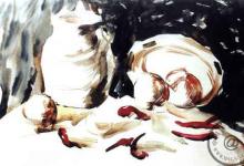 罐子、圆葱和红辣椒色彩写生步骤1、从背景开始着手,注意作画感觉,用干湿两种手法画出圆葱和红辣椒的基本色相。2、此阶段,需要树立整体的观念。作画时,应当从局部入手,