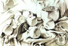 《葡萄和苹果》色彩写生步骤图1、此组静物结构比较复杂,内容繁多。先用铅笔起稿,初步定出物体的基本位置,然后再用单色画出大的素描关系。2、按常规先上后下的着色方式
