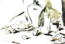 《红苹果》色彩静物写生步骤图1、直接用橄榄绿起稿,确实好静物的黑白灰关系。2、从左到右一遍将暖灰色的背景基本画完,同时也将透明玻璃杯一步到位,这样,色彩写生步骤 色彩静物写生