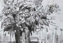 花卉色彩水粉静物写生步骤《花卉》水粉静物写生步骤一、1 作画前先对静物的高低大小、前后位置、黑白灰等方面进行观察比较。以便更好地构图。选择好角度后一般用褐色花卉静物写生步骤