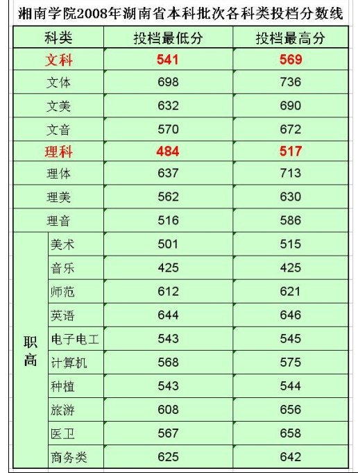 湘南学院2008年湖南省本科层次各专业录取分数线