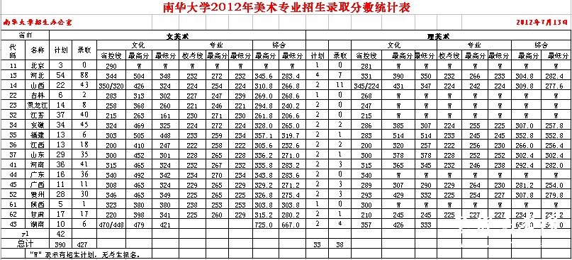 报考南华大学2012年美术(艺术)类专业的考生,文化成绩达到所在省份艺术类录取分数线,专业通过我校组织的专业校校考且成绩合格(湖南省艺术类专业考生须参加全省专业统考且成绩合格),文化、专业成绩按4:6的比例计总分排序录取,总分相同时,英语成绩高的考生优先录取。录取时按美术文、美术理分别录取。
