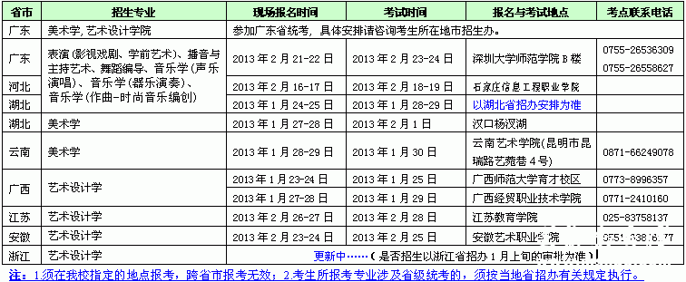 4. 按照教育部和广东省关于规范艺术类招生的要求,学前艺术专业方向2013年为最后一年校考招生,2014年若按艺术类招生将按音乐类统考方式录取,不再进行校考。详见当年公布的简章。