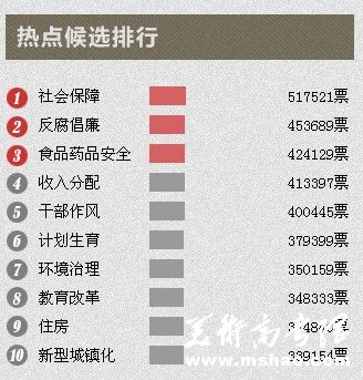 两会热词“社会保障”连续五年列榜首 网民呼吁“马上并轨”网民最期待2014年反腐重点:“坚决查处大案要案”网友关注食品安全:每天为吃担忧 收入再多也不幸福超9成网友对收入现状不满 期待“正常涨工资”两会热词“干部作风”排第五 以权谋私最被诟病“计划生育”列两会热词调查第六 七成网友想要二孩两会热词"环境治理"排第七 网友盼加大环境违法惩戒力度