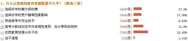 在“什么让您感到教育资源配置不公”调查中,32.45%的网友认为“优质教育资源分布不均”是造成教育资源配置不公平的主要原因,21.8%的网友投票高考分数的地区性差异导致资源配置不均衡,此外分别有17%的网友认为选择好学校在户口、择校费上的限制重重也使他们感到教育资源配置的不公平。