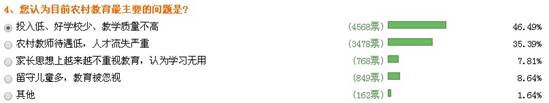 在农村教育存在的问题调查中,46.49%的网友投票“投入低、好学校少、教学质量不高”是最主要的原因,而35.39%的网友认为农村教师待遇低,人才流失严重造成了农村教育质量问题。