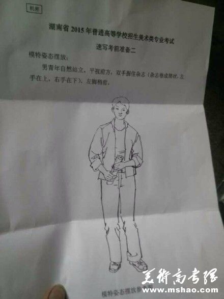 导读摘要:2015年湖南美术联考统考速写考试题目 速写考题:男青年自然站立,平视前方,双手握住杂志(杂志卷成桶状,左手在上、右手在下),左脚稍前。