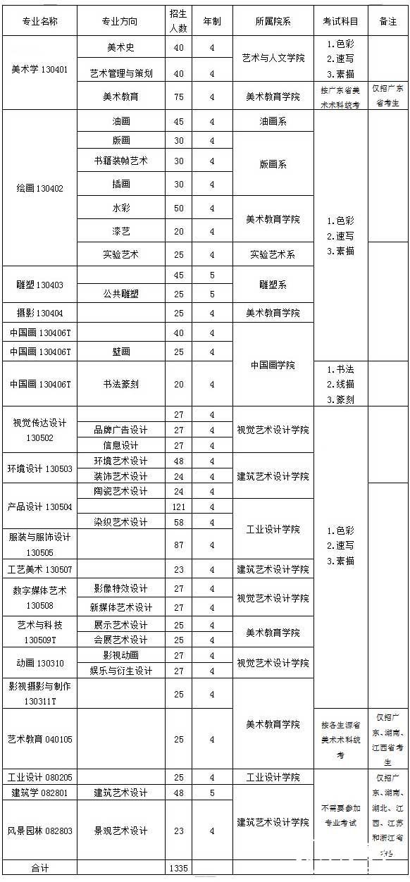 注:①招生专业、计划数以上级主管部门下达的为准;②建筑学及风景园林专业招生考试及录取方式如有调整,以教育部的规定为准;③中国画(书法篆刻)专业仅在北京、南京、郑州、长沙、桂林及广州设点组织专业考试。