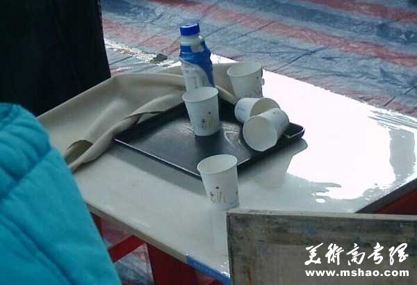 色彩考题:一瓶营养快线,5个白色纸杯,一块蓝色衬布,一个塑料托盘。