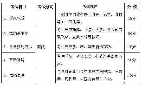 面试,考官目测考察考生在五官、身高、身材、比例、气质等方面所具备的舞蹈自然条件。要求五官端正、身材匀称、比例协调,气质好。