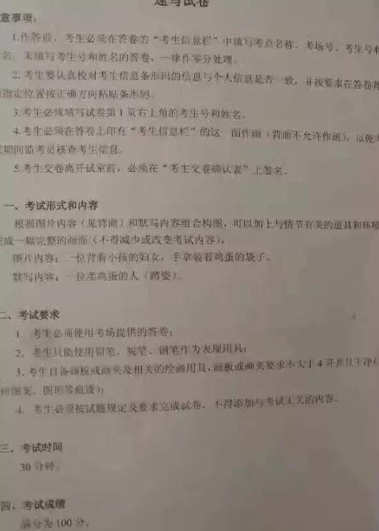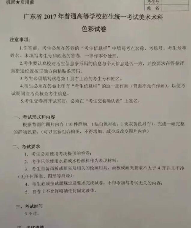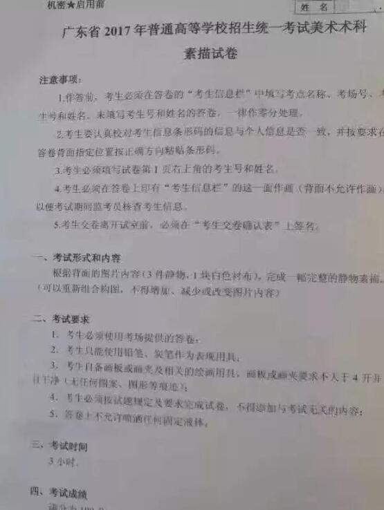 导读摘要:2017年广东美术联考统考考试题目(完整版)2017年广东美术联考素描考题 根据图片内容(3件静物,1块白色衬布),完成一幅完整的静物素描。2017年广东美术联考速写考题 根据图片内容和默写内容组合构图,可以加上与情节有关的道具和环境,组成一幅完整的静物素描 默写内容:一位卖鸡蛋的人(蹲姿)2017年广东美术联考色彩考题
