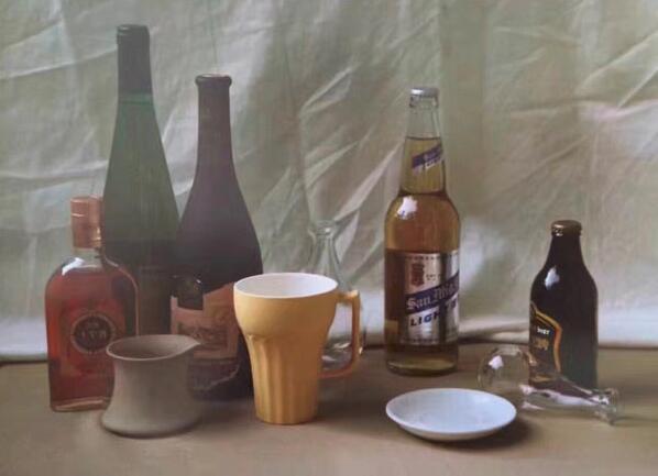 根据图片内容(10件静物,1块白色衬布,1块灰黄色衬布),完成一幅完整的静物色彩(可以重新组合构图,不得增加、减少或改变图片内容)