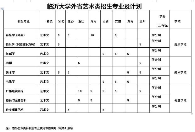 2017年,临沂大学艺术类本科招生专业或方向共16个,拟招生895人。其中,省内投放计划745人,省外投放计划150人。美术类专业投放计划380人,非美术类专业投放计划515人。