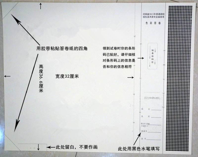发下来的试卷已经由监考老师贴好条码,考生拿到试卷之后首先检查条形码上的相关考号与准考证上的是否一致,然后在试卷上用黑色签字笔填写清楚自己的个人信息;以下是往年河南美术统考的正式试卷照片,请注意上面我们标注的说明: