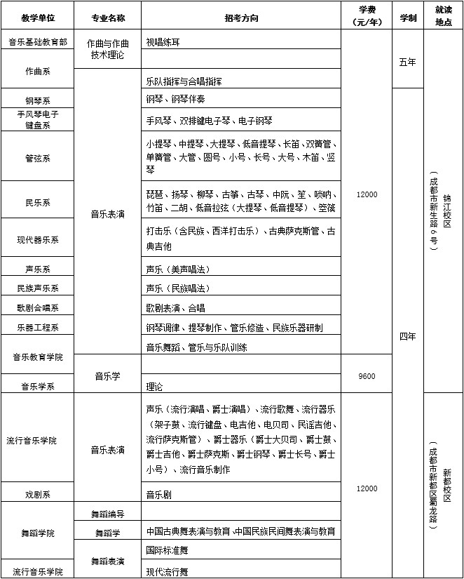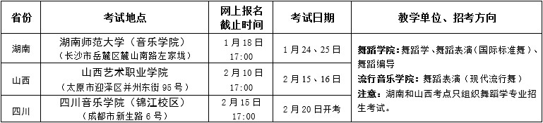3.舞蹈表演(国际标准舞、现代流行舞)、舞蹈编导、摄影、影视摄影与制作各招考方向只在四川音乐学院(锦江校区)考点组织招生专业考试。