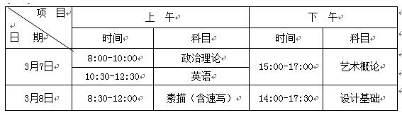 (一)考试科目:省统一考试三门:《政治理论》、《英语》、《艺术概论》;专业课两门:《素描(含速写)》、《设计基础》。各科满分为100分,五科总分为500分。