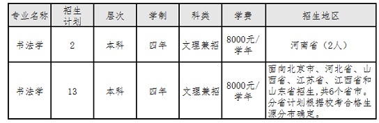 2020年我校书法学专业仅面向北京市、河北省、山西省、江苏省、江西省、山东省、河南省招生。其中河南省作为我校2020年的试点省份,使用省级统考成绩作为考生专业测试成绩,无须参加我校校考;除河南省外的考生均须参加我校校考,以我校校考成绩作为专业测试成绩。