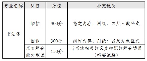 2.在我校书法学专业招生的7个省中,有书法学省级统考的考生,须参加省级统考并取得省统考合格证,河南省考生省统考成绩不低于220分(300分制)。无书法学省级统考的考生,应具有较强的文史素养,熟悉至少一种古代碑帖,具备较强的笔墨驾驭能力并能够独立完成作品;