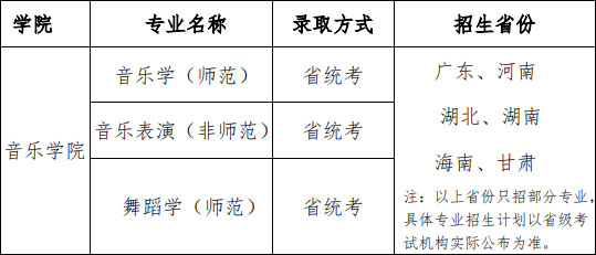 音乐与舞蹈学录取原则:根据各省(自治区、直辖市)投档规则出档后,音乐类、舞蹈类专业分专业录取时,广东省计划以投档总分按“分数优先,遵循志愿”的原则录取;其它外省计划按术科统考成绩从高到低录取,术科统考成绩相同的,按高考文化成绩(排位)录取。