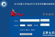 北方民族大学2014年艺术类专业成绩查询网址入口:http: 202 201 112 220 ykcx php 北方民族大学2014年艺术类校考专业合格证执行教育部规定,按招生计划数的4倍以内发放,于2014年4月10日前寄发考生。