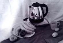 2016年吉林美术联考素描考试题目 静物组合(黑白照片)不锈钢壶,一个盘子里有三个香蕉,一个大辣椒和尖椒, 一个杯子 ,梨 ,一个橘子。
