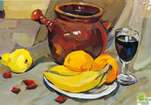 色块的深浅互相衬托是写生是需要注意的问题,此图处理的比较到位,在实际的静物中,也许左侧的鸭梨与后面的白衬布深浅是一样的,或者其中的对比非常小,遇到这样的情况考生就应当注意运用衬托的方法,适当的加重鸭梨后面的深度;相反画面右侧酒杯当中的葡萄酒很深,后面的衬布就要画得浅一些;另外画面中部的水果与后面的汤罐在深浅对比的处理上也是比较好的。