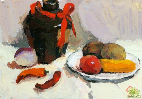 这幅考卷的色彩表现比较有感觉,尽管造型刻画上不是很精致,但是色彩的微妙关系,很能得到评卷教师的喜欢。