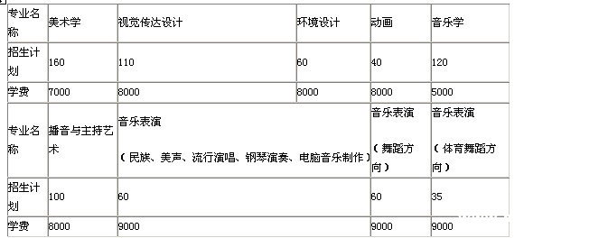 美术学、视觉传达设计、环境设计、动画、 音乐学、音乐表演(声乐、钢琴)、音乐表演(舞蹈方向)、音乐表演(体育舞蹈方向)、 播音与主持艺术 |
