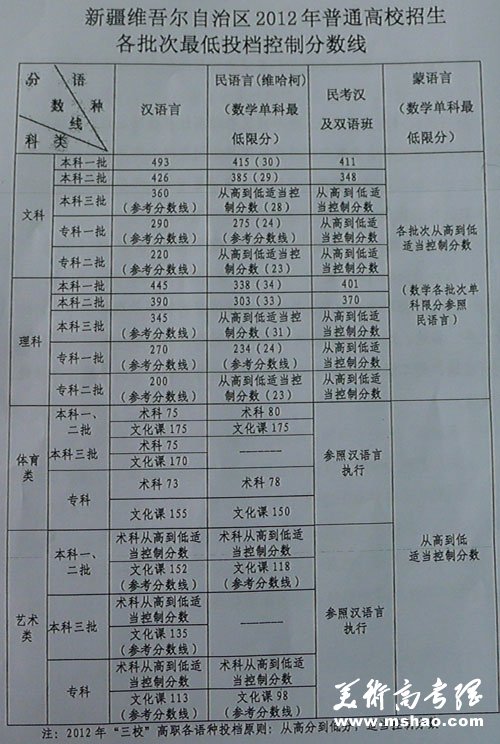 新疆2012年普通高校招生各批次最低投档控制分数线向社会公布。汉语言文科一本为493分、理科一本为445分,录取工作将于7月3日正式开始。