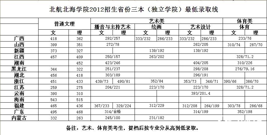 2012年北京航空航天大学北海学院艺术类录取分数线