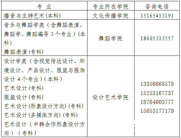 普通专科:舞蹈表演、艺术设计、服装设计、艺术设计(形象设计方向)、艺术设计(多媒体方向)、艺术设计(中韩合作形象设计方向)。
