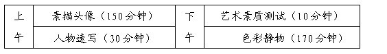 考试科目:素描(100分)、速写(100分)、色彩(100分),均为默写(八开试卷);艺术素质测试(笔试简答,不计总分,仅做参考)。