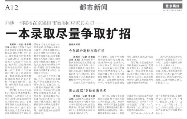 但是所谓“本月15日将根据录取结果尽量争取扩招”的消息还是迅速传播开来。第一次参加高考就遭遇一志愿落榜的考生家长们,宁可相信市教委新闻发言人线联平的讲话是真的。因为不管怎样,也是白纸黑字登载在首都的主流报纸上的报道呀!这些考生家长们的心已经十分地脆弱,每时每刻都在期盼着一丝希望,一棵救命稻草的出现。他们当真盼着7月15日能有奇迹发生,而绝不愿意从高招录取操作程序上去思考怀疑15日一批次扩招发生的可能性。