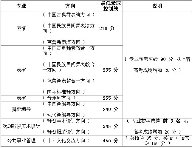 北京舞蹈学院作为31所独立设置本科艺术院校,实施自行划定文化考试录取控制分数线。经学院招生委员会研究,结合2010年我院各专业的一志愿考生文化课成绩,将我院2010年各专业的招生录取最低分数控制线划定如下: