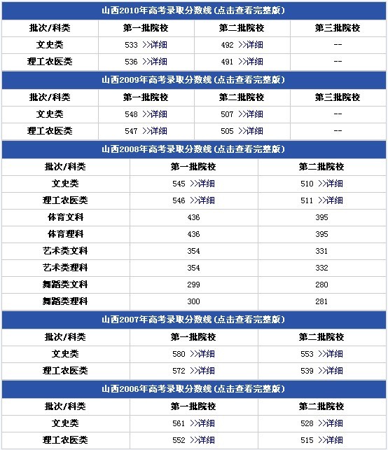 山西省2010年高考录取分数线发布,文史类本科:第一批为533分,第二批为492分;理工类本科:第一批为536分,第二批为491分。