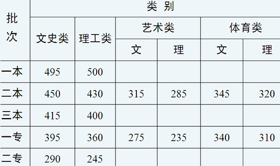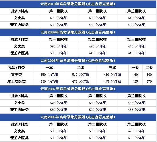 云南2010年高考分数线公布。文史类一本495分,二本450分,三本415分,理工类一本500分,二本430分,三本400分。