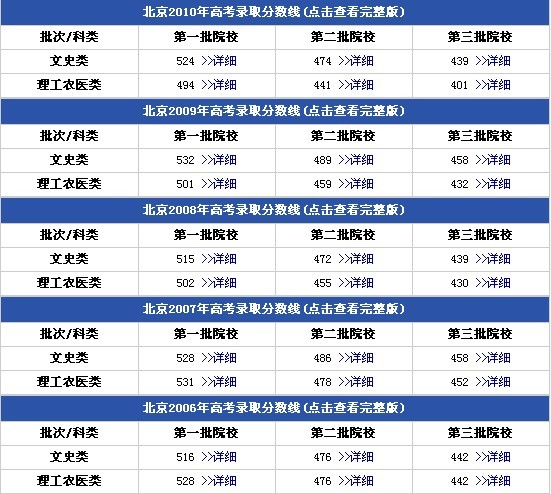 来自北京市教委消息 北京2010年高考录取分数线出炉,文科一本524分,二本474分,三本439分;理科一本494分,二本441分,三本401分。艺术类本科录取控制分数线:文科为308分,理科为287分。专科提前批面试参考线(三科总分):文科180分,理科170分,体育教育,社会体育,休闲体育专业(体育成绩60分)分数线:文科350分,理科330分。