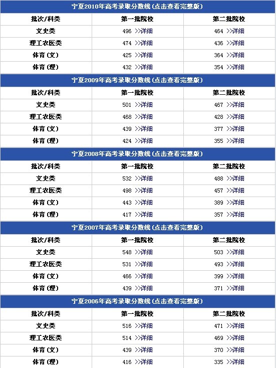 来自宁夏教育考试院的消息,2010年宁夏高考分数线公布。理科一本474分,二本436分;文科一本496分,二本464分,理科体育一本线432分,二本线354分;文科体育一本线425分,二本线364分。宁夏回族自治区2010年普通高等学校招生本科录取分数线