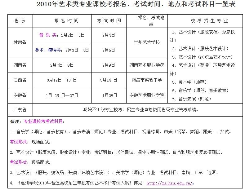 2、专业课校考,考生凭本人身份证、高考准考证、《惠州学院2010年普通高校招生艺术类专业校考准考证》,按规定时间、考点,参加我院专业课考试。专业成绩合格考生由学院发放专业合格证( 专业成绩不合格者不另行通知)。