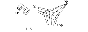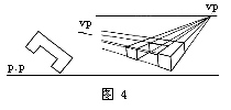 物体有一组垂直线与画面平行,其他两组线均与画面成一角度,而每组有一个消失点,共有两个消失点,也称成角透视。二点透视图面效果比较自由、活泼,能比较真实地反映空间。缺点是,角度选择不好易产生变形(图4)。