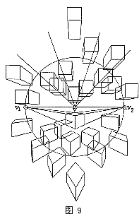 如图:用两个消失点V1、V2的距离作为直径画圆形。越近于圆中心的,越看得自然,越远的越不自然,离开圆形,位于外侧的,使人看不出它是正方形和正六面体。平行透视法尽量限定对象物并设定其相近V,有角透视法,要把对象纳入V1、V2的内侧来画,若要脱离这种规则,需要做若干的调整(图9)。