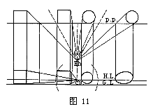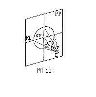 在画透视图时,人的视野可假设为以视点E为顶点圆锥体,它和画面垂直相交,其交线是以C.V.为圆心的圆,圆锥顶角的水平,垂直角为60°,这是正常视野作的图,不会失真。在平面图上,在视角为60°范围以内的立方体,球体的透视形象真实,在此范围以外的立方体,球体失真变形(图10、11)。