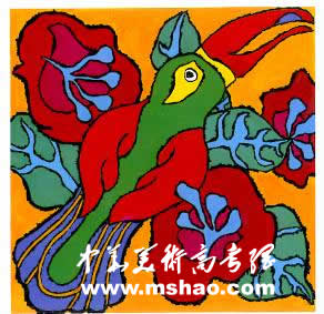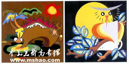 评析:色彩对比强烈,对乌与叶的形态特征把握得较好。黑色轮廓线处理,使画面效果强烈,富有装饰感。但所选的动物形象不切合题意。