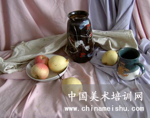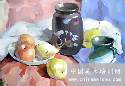 水彩、水粉画的技法是比较多样的,但大致不外乎干画法和湿画法两种。所谓干画,即少用水的意思,并非不掺水而仅用颜料干擦,作画时要待前一层颜色干后再涂上第二层色,层层加叠,前一层色与第二层色有较明晰的界限,所以也有称之为多层画法。干画法落笔应力求肯定、准确,以求表现明确的形体以及各种层次和体面的转折关系。干画法应注意的是:在底色未干时不要急于覆盖,以防止底色泛上来;且颜色覆盖的次数也不宜太多,覆盖大多或颜色堆得太厚,会使色彩变灰、变腻。干画法不太受时间的限制,便于从容作画,较易掌握,对于初学者锻炼严格的造型能力是很有帮助的。但干画法不易发挥水色流动的特色,运用不好会产生干涩、生硬等弊病。